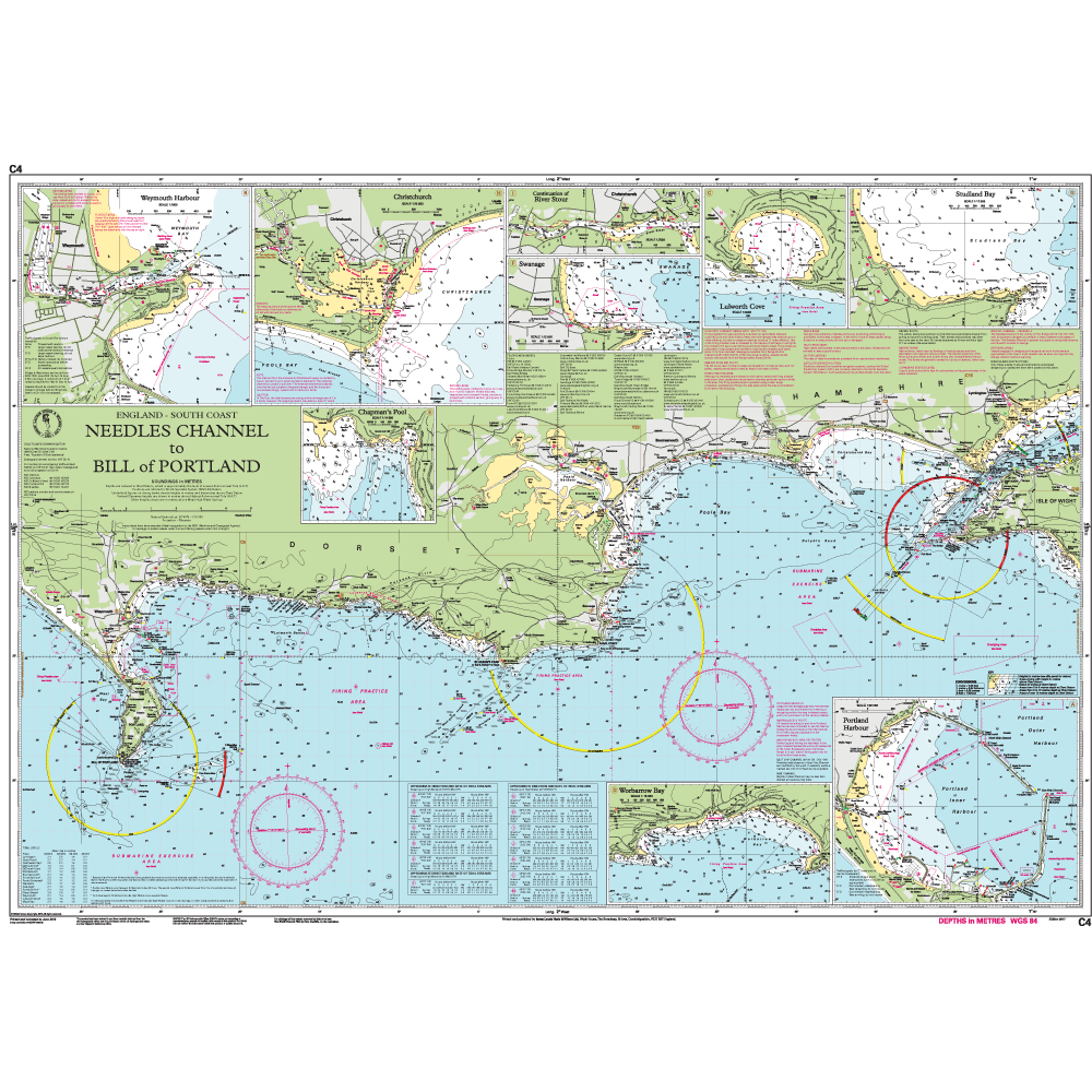 De vouwkaart Imray Chart C4 van de Engelse kaartenfabrikant Imray bestrijkt de verbinding van het baken The Needles ten westen van het Isle of Wight tot het baken Bill of Portland bij Dorset aan de Engelse Kanaalkust. De laatste correctie van de grafiek C4 vond plaats in januari 2023. In deze editie zijn voor zover beschikbaar de meest recente dieptemetingen gebruikt. Een nieuw plan van Chapman's Pool is nu in deze kaart opgenomen. De grafiekspecificatie is verbeterd om gekleurde lichtflitsen te tonen. Er zijn algemene updates gemaakt voor de hele kaart. Alle kaarten zijn gedrukt op stevig en watervast papier. De nautische kaart meet 787 x 1118 cm en de schaal is 1 : 75.000.
